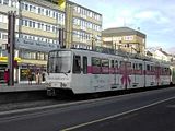 The Stadtbahnwagen Typ B (translation Type "B" Light Rail Vehicle, short form B-Wagen) is a light rail vehicle used by several Stadtbahn networks in the German state of North Rhine-Westphalia. It was mainly developed by Düsseldorf-based DUEWAG, who also built the majority of vehicles in a consortium with Siemens and Kiepe. A small series of ten units was built by Waggon Union in Berlin. As the type evolved over two decades of production, some vehicles have little more in common than their outer dimensions and the basic configuration of a two-part multiple unit on three bogies with both outer ones powered. For the Dortmund Stadbahn, some cars were modified with a central section and a fourth bogie. These vehicles are referred to as B8 or B80C/8 (eight axles). These vehicles have a length of 38 m (124 ft 8 1&fras1;8 in) and a weight of 49 t (48 long tons; 54 short tons).