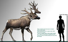 It was as large as the moose, with an elk-like head, long legs, and palmate antlers that were more complex and heavily branching than the moose.[3] Cervalces scotti reached 2.5 m (8.2 ft) in length and a weight of 708.5 kg (1,562 lb).[4][5] The stag-moose resided in North America during an era with other megafauna such as the woolly mammoth, ground sloth, long horn bison, and saber toothed cat.[6] The species became extinct approximately 11,500 years ago, toward the end of the most recent ice age, as part of a mass extinction of large North American mammals.[7][8]