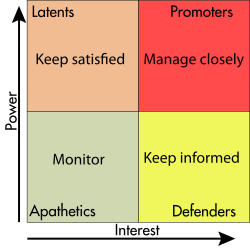 - Mendelow's power-interest grid, which considers stakeholder "power and expectations (and therefore their likely interest) ... to determine the potential influence of stakeholder groups"[11]