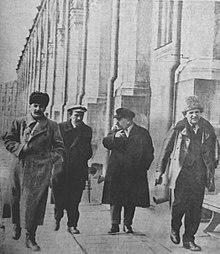 Stalin helped organise the July Days uprising, an armed display of strength by Bolshevik supporters.[167] After the demonstration was suppressed, the Provisional Government initiated a crackdown on the Bolsheviks, raiding Pravda.[168] During this raid, Stalin smuggled Lenin out of the newspaper's office and took charge of the Bolshevik leader's safety, moving him between Petrograd safe houses before smuggling him to Razliv.[169] In Lenin's absence, Stalin continued editing Pravda and served as acting leader of the Bolsheviks, overseeing the party's Sixth Congress, which was held covertly.[170] Lenin began calling for the Bolsheviks to seize power by toppling the Provisional Government in a coup d'état. Stalin and fellow senior Bolshevik Leon Trotsky both endorsed Lenin's plan of action, but it was initially opposed by Kamenev and other party members.[171] Lenin returned to Petrograd and secured a majority in favour of a coup at a meeting of the Central Committee on 10 October.[172]