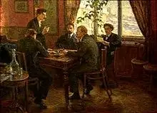 Stalin joined a forbidden book club at the school;[37] he was particularly influenced by Nikolay Chernyshevsky's 1863 pro-revolutionary novel What Is To Be Done?[38] Another influential text was Alexander Kazbegi's The Patricide, with Stalin adopting the nickname "Koba" from that of the book's bandit protagonist.[39] He also read Capital, the 1867 book by German sociological theorist Karl Marx.[40] Stalin devoted himself to Marx's socio-political theory, Marxism,[41] which was then on the rise in Georgia, one of various forms of socialism opposed to the empire's governing tsarist authorities.[42] At night, he attended secret workers' meetings[43] and was introduced to Silibistro "Silva" Jibladze, the Marxist founder of Mesame Dasi ("Third Group"), a Georgian socialist group.[44] Stalin left the seminary in April 1899 and never returned.[45]