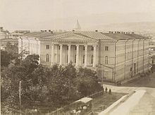 On 24 October, police raided the Bolshevik newspaper offices, smashing machinery and presses; Stalin salvaged some of this equipment to continue his activities.[173] In the early hours of 25 October, Stalin joined Lenin in a Central Committee meeting in the Smolny Institute, from where the Bolshevik coup—the October Revolution—was directed.[174] Bolshevik militia seized Petrograd's electric power station, main post office, state bank, telephone exchange, and several bridges.[175] A Bolshevik-controlled ship, the Aurora, opened fire on the Winter Palace; the Provisional Government's assembled delegates surrendered and were arrested by the Bolsheviks.[176] Although he had been tasked with briefing the Bolshevik delegates of the Second Congress of Soviets about the developing situation, Stalin's role in the coup had not been publicly visible.[177] Trotsky and other later Bolshevik opponents of Stalin used this as evidence that his role in the coup had been insignificant, although later historians reject this.[178] According to the historian Oleg Khlevniuk, Stalin "filled an important role [in the October Revolution]... as a senior Bolshevik, member of the party's Central Committee, and editor of its main newspaper";[179] the historian Stephen Kotkin similarly noted that Stalin had been "in the thick of events" in the build-up to the coup.[180]