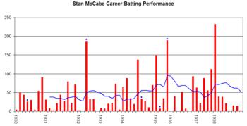 Stanley Joseph McCabe (16 July 1910 – 25 August 1968) was an Australian cricketer who played 39 Test matches for Australia from 1930 to 1938. A short, stocky right-hander, McCabe was described by Wisden as "one of Australia's greatest and most enterprising batsmen" and by his captain Don Bradman as one of the great batsmen of the game.[1] He was never dropped from the Australian Test team[2] and was known for his footwork, mastery of fast bowling and the hook shot against the Bodyline strategy. He also regularly bowled medium-pace and often opened the bowling at a time when Australia lacked fast bowlers, using an off cutter. He was one of the Wisden Cricketers of the Year in 1935.[3]