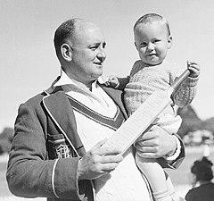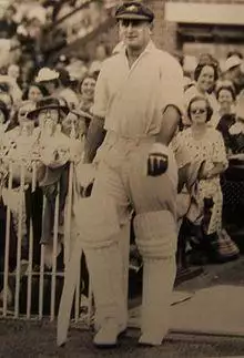 McCabe was briefly a member of the Australian Defence Force during the Second World War, joining in late 1942. Due to his poor health and feet, he knew that his utility would be limited, and he also had a newborn son and fledgling business at the time, so he had not rushed to enlist at the start of the war. Due to McCabe's incapacitation, he was given a clerical job at the Victoria Barracks. He stayed in the role for 12 months before his feet problems resulted in an early discharge.[2][95] He was appointed to serve on the Sydney Sports Ground and Cricket Ground Trust and operated a sports store in George Street, Sydney from its opening until his death.[96] McCabe often hired cricketing colleagues as salesmen; his close friend O'Reilly worked there in the late-1930s,[97] as did paceman Ray Lindwall after the war,[98] Lindwall opted to work for McCabe because he was offered leave to travel overseas for Test tours.[98]