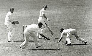 McCabe made 27 in the rain-affected draw in the Fourth Test, the culmination of a quiet fortnight in which he failed to pass 30. He then scored fifties in three consecutive tour matches before the Fifth Test, which was timeless as the series was tied 1–1.[18] McCabe scored 10 and 70 and took 2/5 in the second innings as Australia won the match by 562 runs to regain the Ashes 2–1.[18][29] McCabe aggregated 483 runs at 60.37 and took four wickets in the Tests. At the time, Wisden said of him: "He blossomed forth as an almost completely equipped batsman of the forcing type and was probably the best exponent—Bradman himself scarcely excluded—of the art of hitting the ball tremendously hard and safely."[3] Wisden said that McCabe had made "immense strides" in his batting technique. It said "In 1930 he gave the impression of still having a good deal to learn; he was inclined to be somewhat slapdash in his methods. The intervening years had clearly made a great difference in him. Losing nothing of his power, he displayed a wider and safer range of strokes."[10] McCabe finished the tour with 108 against Kent and 124 in an innings win over HDG Leveson-Gower's XI a took 21 wickets for the entire season.[18]
