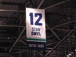 Smyl retired with Canucks franchise records in every major statistical category with 262 goals, 411 assists and 673 points in 896 games played.[7] He became the first Canucks player to have his jersey number retired as his #12 was raised to the rafters at the Pacific Coliseum on November 3, 1991.[7][34] In 2000, he was inducted into the British Columbia Hockey Hall of Fame.[35]