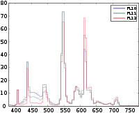 F1–F6 "standard" fluorescent lamps consist of two semi-broadband emissions of antimony and manganese activations in calcium halophosphate phosphor.[21] F4 is of particular interest since it was used for calibrating the CIE color rendering index (the CRI formula was chosen such that F4 would have a CRI of 51). F7–F9 are "broadband" (full-spectrum light) fluorescent lamps with multiple phosphors, and higher CRIs. Finally, F10–F12 are narrow triband illuminants consisting of three "narrowband" emissions (caused by ternary compositions of rare-earth phosphors) in the R,G,B regions of the visible spectrum. The phosphor weights can be tuned to achieve the desired CCT.