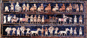 "War" is one of the earliest representations of a Sumerian army, engaged in what is believed to be a border skirmish and its aftermath. The "War" panel shows the king in the middle of the top register, standing taller than any other figure, with his head projecting out of the frame to emphasize his supreme status – a device also used on the other panel. He stands in front of his bodyguard and a four-wheeled chariot, drawn by a team of some sort of equids (possibly onagers or domestic asses;[7] horses were only introduced in the 2nd millennium BC after being imported from Central Asia[8]). He faces a row of prisoners, all of whom are portrayed as naked, bound and injured with large, bleeding gashes on their chests and thighs – a device indicating defeat and debasement.[3] In the middle register, eight virtually identically depicted soldiers give way to a battle scene, followed by a depiction of enemies being captured and led away. The soldiers are shown wearing leather cloaks and helmets; actual examples of the sort of helmet depicted in the mosaic were found in the same tomb.[5] The nudity of the captive and dead enemies was probably not meant to depict literally how they appeared in real life, but was more likely to have been symbolic and associated with a Mesopotamian belief that linked death with nakedness.[9]