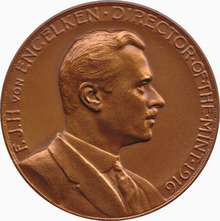 On July 18, Woolley wrote to a numismatic enquirer that the new quarters would begin to be struck about September 1.[31] By the time of that letter, he had resigned as Mint Director to become head of publicity for President Wilson's reelection campaign; Fred H. Chaffin became acting director. On August 18, Wilson nominated Woolley's successor, Friedrich Johannes Hugo von Engelken, who was promptly confirmed by the Senate. Von Engelken was supposed to be sworn in on the 21st; his swearing in was delayed until September 1 by President Wilson's failure to sign his commission. One of von Engelken's first acts as Mint Director was to inform MacNeil of McAdoo's acceptance of the design changes, telling him he could place his monogram (a small "M") on the coin; it appears on the wall, to the right of the two low steps which Liberty descends.[34] The bronze casts were made by the Medallic Art Company; on September 6, MacNeil wrote to von Engelken that they would shortly be shipped to the Philadelphia Mint.[34]