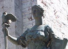 MacNeil's accepted obverse is only slightly less militaristic; his Liberty faces to the viewer's right (heraldic east) in the direction of the European war, and her shield faces in that direction as well. She holds an olive branch as she strides through a gate in a wall which is inscribed, "In God We Trust", with the "U" in "Trust" shaped as a V.[26] MacNeil stated that the obverse depicted Liberty "stepping forward in ... the defense of peace as her ultimate goal".[27] According to art historian Cornelius Vermeule, "Liberty is presented as the Athena of the Parthenon pediments, a powerful woman striding forward"[21] and states that, but for the Stars and Stripes on her shield, "everything else about this Amazon calls to mind Greek sculpture of the period between Pheidias to Praxiteles, 450 to 350 BC."[28]