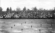 Stanford has fielded a college rugby team since 1906, and replaced football entirely until 1917. Stanford achieved one of the most surprising victories of American rugby's early history by beating a touring Australian club team in 1912.[24] Rugby remained a varsity sport at Stanford until 1977.[25] Despite the loss of varsity status, the Stanford Rugby Foundation covers many of the team's expenses from an endowment fund. Rugby is one of the largest sports programs on campus with over 100 players.[25] Stanford Rugby is led by Director of Rugby Matt Sherman, who has served as an assistant coach for the U.S. men's national team.[26]