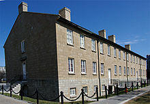 A series of six stone buildings were constructed around 1840 by the Royal Engineers of the British Army with the biggest building being the Officers' Quarters.[4] The two-storey Queenston limestone structure cost 19,000 pounds sterling. The fort also included two privates' barracks (holding 207 and 105 soldiers), a hospital, an officers' stable, barracks master's store, an engine house, gunpowder magazine and a canteen, all organized around a parade square.[5] The original plan included fortifications surrounding the fort but as a cost-saving measure a cedar picket fence to enclose the fort was constructed, with fortifications to be added at some later time.[6] A road was built between the forts, entering the new fort through a wrought-iron gate and passing under an arch in the eastern privates' barracks.