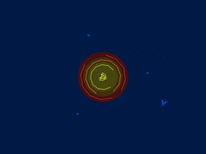 Once the innermost ring has been breached, the central weapon is vulnerable to attack from the player. However, the player is also more vulnerable at this point, as with the shield rings eliminated, the gun can fire out a large projectile that hisses with white noise. Moreover, the central core tracks player movement at all times. If the player manages to hit the cannon, it explodes violently, collapsing the remnants of the shield rings, and the player is awarded with an extra ship. The next level then starts with a new gun and fully restored shield rings, with the difficulty increased (the mines move faster, the rings rotate more quickly, and the core tracks the player faster).