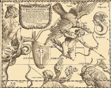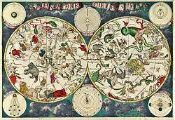 During the European Age of Discovery, expeditions to the southern hemisphere began to result in the addition of new constellations. These most likely came from the records of two Dutch sailors, Pieter Dirkszoon Keyser and Frederick de Houtman, who in 1595 traveled together to the Dutch East Indies. Their compilations resulted in the 1601 globe of Jodocus Hondius, who added 12 new southern constellations. Several other such maps were produced, including Johann Bayer's Uranometria in 1603.[17] The latter was the first atlas to chart both celestial hemispheres and it introduced the Bayer designations for identifying the brightest stars using the Greek alphabet. The Uranometria contained 48 maps of Ptolemaic constellations, a plate of the southern constellations and two plates showing the entire northern and southern hemispheres in stereographic polar projection.[18]