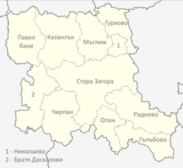 Stara Zagora (Bulgarian: Област Стара Загора), formerly known as the Stara Zagora okrug, is a province of south-central Bulgaria. It is named after its administrative and industrial centre—the city of Stara Zagora—the sixth-biggest town in the country. The province embraces a territory of 5,151.1 km2 (1,988.9 sq mi)[1] that is divided into 11 municipalities with a total population, as of December 2009, of 350,925 inhabitants.[2][3][4]