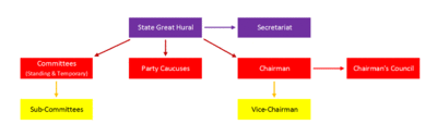 The Chairman's Council consists of the Vice-Chairman of the State Great Khural, Chairmen of the caucuses, leaders of parliamentary parties, and Chairmen of standing/temporary committees. The Chairman's Council is responsible for the following duties: