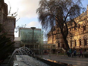 The Library manages, in collaboration with the History Trust of South Australia, the Centre of Democracy on the corner of North Terrace and Kintore Avenue.[21] The Centre's gallery exhibits treasures from History Trust and State Library collections, as well as items on loan from State Records of South Australia, the Art Gallery of South Australia, the Courts Authority, Parliament House, Government House and private lenders.[22]