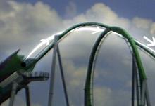 An inclined dive loop is essentially a dive loop that has been tilted. Instead of exiting vertically, an inclined dive loop exits at an angle. The only two examples are on Hydra the Revenge at Dorney Park & Wildwater Kingdom and GateKeeper at Cedar Point.