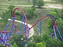 A vertical loop is one of the most common roller coaster inversions in existence. It is a continuous, upward-sloping section of track that eventually completes a 360-degree turn, inverting riders halfway into the element. They are ellipses in the shape of an oval or teardrop. Early roller coaster designs attempted vertical loops that were more circular, resulting in massive g-force that were dangerous to riders. The first successful implementation in the modern era of roller coasters was on Great American Revolution which opened at Six Flags Magic Mountain in 1976.