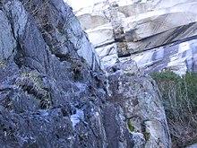This feature divides the Grand Wall from the Dihedral Wall to the south. This feature is considerably younger than the pale granodiorite rock surrounding it. It formed by the splitting of the solid granodiorite along a vertical fracture, which created a conduit for basalt and andesite magmas, which may have fed volcanoes on the surface above the then-buried granitic rock. These younger magmas cooled quite quickly, which results in a very fine grained, almost glassy texture. The resulting dyke is now clearly visible from the Chief's main parking area.