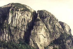The Stawamus Chief, officially Stawamus Chief Mountain[1] (often referred to as simply The Chief, or less commonly Squamish Chief), is a granitic dome located adjacent to the town of Squamish, British Columbia, Canada. It towers over 700 m (2,297 ft) above the waters of nearby Howe Sound. It is one of the largest granite monoliths in the world.[2]