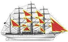 A staysail ("stays'l") is a fore-and-aft rigged sail whose luff can be affixed to a stay running forward (and most often but not always downwards) from a mast to the deck, the bowsprit, or to another mast (the mast is item 13 in the illustration right).