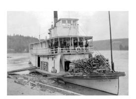 For ten years the area was without steamer service until the Charlotte was built by Alexander Watson for the North British Columbia Navigation Company in 1896. The N.B.C.N.C was organized by Senator James Reid of Quesnel, Captain John Irving of Victoria and Stephen Tingley of Ashcroft. Tingley, at this time had been the owner of the BC Express Company for eight years, having been the most famous of the "bull whips" of the Cariboo Road. They hired Captain Frank Odin to pilot her. He was her captain until 1906, when Captain Owen Forrester Browne became her pilot.[2] The Charlotte was the only steamer on the upper Fraser until 1909 when it was announced the Grand Trunk Pacific Railway would be crossing the Fraser River at Fort George. The Quesnel was launched by Telesphore Marion, a pioneer merchant from the town of the same name. It would become the fourth sternwheeler to work the upper Fraser and would also be the last. Her pilot was Captain DA Foster.[3]