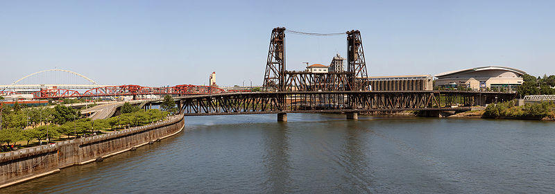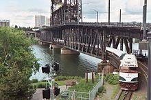The Steel Bridge is a through truss, double-deck vertical-lift bridge across the Willamette River in Portland, Oregon, United States, opened in 1912. Its lower deck carries railroad and bicycle/pedestrian traffic, while the upper deck carries road traffic (on the Pacific Highway West No. 1W, former Oregon Route 99W), and light rail (MAX), making the bridge one of the most multimodal in the world. It is the only double-deck bridge with independent lifts in the world[1] and the second oldest vertical-lift bridge in North America, after the nearby Hawthorne Bridge. The bridge links the Rose Quarter and Lloyd District in the east to Old Town Chinatown neighborhood in the west.