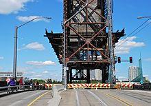 Until the bridge's mid-1980s renovation, the crossing gates blocking the roadway and sidewalks during raising of the upper-deck lift span were manually operated, rotated horizontally across the roadway by two "gate tenders", one on each side of the lift span.[4]:8 Small shacks for the gatekeepers were positioned on the roadway deck, between the inner and outer traffic lanes, but they were removed during the 1980s rebuilding[4]:21 and replaced by a new gate tender house positioned above the roadway, in the west lift tower.[4]:8 Powered crossing gates replaced the manual ones, and operation of the gates is now automated, controlled by the bridge operator.[4]:21