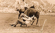 Historically, steer wrestling was not a part of ranch life. The event originated in the 1890s, and is claimed to have been started by an individual named Bill Pickett, a Wild West Show performer said to have caught a runaway steer by wrestling it to the ground.[3] There are several versions of the story, some claiming that he developed the idea after he observed how cattle dogs worked with unruly animals.[4]