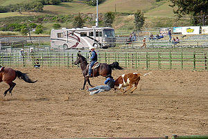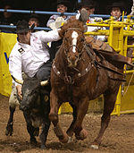 Steer wrestling, also known as bulldogging, is a rodeo event in which a horse-mounted rider chases a steer, drops from the horse to the steer, then wrestles the steer to the ground by grabbing its horns and pulling it off-balance so that it falls to the ground. The event carries a high risk of injury to the cowboy. There are some concerns from the animal rights community that the competition may include practices that constitute cruelty to animals, but the injury rate to animals is less than five-hundredths of one percent.[1] A later PRCA survey of 60,971 animal performances at 198 rodeo performances and 73 sections of "slack" indicated 27 animals were injured, again approximately five-hundredths of 1 percent – 0.0004.[2]