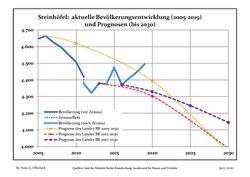 Recent Population Development and Projections (Population Development before Census 2011 (blue line); Recent Population Development according to the Census in Germany in 2011 (blue bordered line); Official projections for 2005-2030 (yellow line); for 2014-2030 (red line); for 2017-2030 (scarlet line)