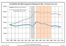 Development of population since 1875 within the current Boundaries (Blue Line: Population; Dotted Line: Comparison to Population development in Brandenburg state; Grey Background: Time of Nazi Germany; Red Background: Time of communist East Germany)