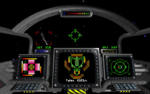 When flying, the main view is a first-person look from inside the cockpit at the cockpit screens (HUDs) and the space before the ship. Space combat simulation is similar to the style of other Wing Commander games of its time. On planets and bases, a static overview/first-person-view is used to show the rooms and interact with people. Menus are used for buying, selling, or taking missions from the mission computer.