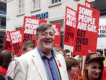 Fry struggled to keep his homosexuality secret during his teenage years at public school, and by his own account did not engage in sexual activity for 16 years until the mid-1990s.[188] When asked when he first acknowledged his sexuality, Fry quipped: "I suppose it all began when I came out of the womb. I looked back up at my mother and thought to myself, 'That's the last time I'm going up one of those'."[189] Fry was in a 15-year relationship with Daniel Cohen, which ended in 2010.[190] Fry was listed number 2 in 2016 and number 12 in 2017 on the Pride Power list.[191][192]