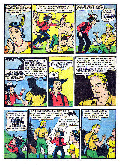 The strip initially revolved around humorous tales, such as stories about people trying to cheat Wahoo out of his money or fish-out-of-water tales of Wahoo in New York or Hollywood. But from the beginning, it was a continuity strip, and had already moved into serious adventure by 1940, when a dashing young photojournalist named Steve Roper was introduced. (Sundays continued to do gags until rejoining the main plot line in 1944.) By World War II, Roper was the lead in war-oriented adventures, and the strip was retitled Chief Wahoo and Steve Roper in 1945, then Steve Roper and Wahoo in 1946, and in 1948 simply Steve Roper,[1] as Wahoo and Minnie were written out (last seen on February 21[7] and November 19, 1947,[8] respectively). As a very different kind of strip now, its artwork lost its earlier cartoonishness, ghosted by artists like Woggon's brother Bill Woggon, Don Dean, and (from December 1945 to July 1954) Pete Hoffman. But Woggon remained the strip's letterer and researcher until 1977, shortly before his death in 1978.