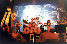 In 1985, Vai joined David Lee Roth's post-Van Halen band as lead guitarist, together with former Talas Bassist Billy Sheehan on bass; and former Maynard Ferguson drummer Gregg Bissonette on drums. The foursome's debut album Eat 'Em and Smile, released on July 7, 1986, was both a critical and commercial success, reaching number four on the Billboard 200 albums chart and selling over two million copies. Guitar World magazine editor Brad Tolinski commented on Vai's playing at the time, saying that "Steve Vai's guitar wizardry is so profound that in earlier times he would have been burned as a witch."[30] Retrospectively, Eat 'Em and Smile is frequently evaluated as one of the greatest rock albums of the 1980s.[31] The group's Eat 'Em and Smile Tour began in August 1986 and continued through February 1987.