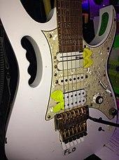 Vai's personal studio, The Harmony Hut, is a large edifice located in his backyard equipped with a full control room and performance room.[107] The studio, built in 2011, is where Vai currently produces, records, and mixes his new material. Vai has two main signature series Ibanez JEM six-string guitars (dubbed "EVO"[108] and "FLO III"[109]) that he uses live and in the studio. "EVO", a prototype Ibanez JEM 7VWH, was received in 1993 while developing Vai's signature DiMarzio Evolution pickups (hence the name of the guitar), and "FLO III" is a basswood Ibanez Los Angeles Custom Shop JEM 7VWH equipped with a Fernandes Sustainer system and a DiMarzio PAF Pro pickup in bridge position.[110][111]