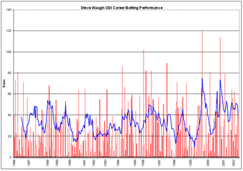Heading into the 1989 Ashes series, Waugh's batting average was 30.52 from 26 Tests.[50] In the three-match ODI series that preceded the Tests, Waugh scored 113 runs at 37.66 and took three wickets at 54.00.[42][43]