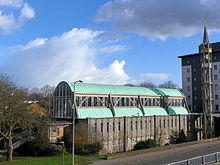 Next to the Town Garden, the Church of St Andrew and St George is an example of modern church design and has housed Stevenage Museum in its crypt since 1976. The church is a Grade 2 listed building. It is also the largest parish church to have been built in England since World War Two. Her late Majesty Queen Elizabeth the Queen Mother laid the foundation stone in July 1956 and was also present at the consecration of the Bishop of St Alban's, the Right Reverend Michael Gresford-Jones, on Advent Sunday 27 November 1960. The frame is constructed from a continuous pour of concrete into moulds, creating interlacing arches and leaving no apparent joints. There are twelve Purbeck-marble columns around the high altar and the external walls are clad in panels faced with Normandy pebble. The campanile houses the loudspeakers for an electro-acoustic carillon. A popular sculpture, 'The Urban Elephant' by Andrew Burton, was commissioned in 1992.