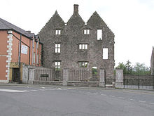 Stewart Castle (also known as Newtownstewart Castle) is situated in Newtownstewart, County Tyrone, Northern Ireland. It was built in 1619 by Sir Robert Newcomen in an English manor house style. It suffered extensive damage during the Irish Rebellion of 1641 and its subsequent capture by Sir Phelim O' Neill, and in 1689 on King James' return from the Siege of Derry. King James ordered the Stewart Castle, and the town, to be burnt down. In the main street a piece of the castle wall still stands.