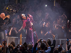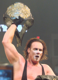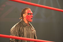 Over the next few weeks, Sting displayed a more maniacal character similar in look and style to Heath Ledger's portrayal of the Joker from the 2008 film The Dark Knight.[87][88] On the July 14 edition of Impact Wrestling, Sting, now dubbed as the "Insane Icon", regained the TNA World Heavyweight Championship from Mr. Anderson, after Fortune and Kurt Angle, disguised as his clown minions, attacked each member of Immortal, preventing them from interfering in the match.[89][90] He would go on to lose the title to Kurt Angle on August 7 at Hardcore Justice, after Angle hit him with a chair brought to the ring by Hulk Hogan.[91] Sting continued tormenting head members of Immortal with his strange new personality, and on the August 18 edition of Impact Wrestling, his longtime rival Ric Flair made his return to TNA and challenged him to a match. Sting agreed to put his career on the line in the match in exchange for Flair promising to deliver him his long-awaited match with Hogan, should he be able to defeat him.[92] On the September 1 edition of Impact Wrestling, Sting received a rematch against Angle for the TNA World Heavyweight Championship, but was defeated following interference from special enforcer Hulk Hogan and the rest of Immortal.[93] On September 11 at No Surrender, Hogan once again cost Sting the TNA World Heavyweight Championship in a three-way match, which also included Mr. Anderson.[94] On the September 15 edition of Impact Wrestling, Sting defeated longtime rival Ric Flair to earn the right to face Hogan at Bound for Glory.[95][96] On the October 6 edition of Impact Wrestling, after being exposed for his false claim of retiring and his secret ridicule of the fans, a furious Hogan impulsively agreed to hand TNA back to Dixie Carter, should Sting manage to defeat him at Bound for Glory.[97] On October 16 at Bound for Glory, Sting defeated Hogan to bring Dixie Carter back to power. After the match, Hogan turned on Immortal and helped Sting overcome the odds in his battle with the stable.[98] On the following edition of Impact Wrestling, Carter placed Sting in charge of the program.[99] Sting returned to the ring on the December 22 and February 9, 2012, editions of Impact Wrestling, where he teamed up with Jeff Hardy to defeat TNA World Heavyweight Champion Bobby Roode and Bully Ray both times.[100][101]