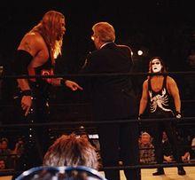 Sting began to question Hogan's trustworthiness and credibility in the weeks leading up to Fall Brawl. At the September pay-per-view, Luger brought a baseball bat to the ring and Sting used it to beat Hogan for his sixth and final WCW World Heavyweight Championship, turning heel for the first time in WCW. Sting's heel turn and subsequent attitude change did not resonate with the WCW fans.[3] They still cheered Sting despite the fact he was supposed to be the villain (reminiscent of The Road Warriors' heel turn in late 1988). It was during this heel turn that Sting and Luger, with helpful interference from DDP, defeated supposed faces Hogan and Hart in a tag-match, Sting pinning Hart after Luger hit him with a bat. Then, at Halloween Havoc, Sting retained the WCW World Heavyweight title against Hogan after Hogan entered the ring in street clothes and laid down for Sting to pin him. After the match, Sting sounded his disdain of the result and issued an open challenge for later tonight. Later that night, Sting lost an unsanctioned match to Goldberg, who accepted his open challenge and then attacked referee Charles Robinson. Sting was stripped of the title the next night for attacking the official.