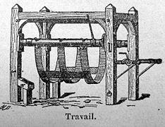 In the past the principal use of the crush, in England also known as a trevis,[17] was for the shoeing of oxen. Crushes were, and in places still are, used for this purpose in North America and in many European countries. They were usually stand-alone constructions of heavy timbers or stone columns and beams. Some crushes were simple, without a head bail or yoke, while others had more sophisticated restraints and mechanisms; a common feature is a belly sling which allows the animal to be partly or wholly raised from the ground. In Spain, the crush was a village community resource and is called potro de herrar, or "shoeing frame". In France it is called travail à ferrer (plural travails, not travaux) or "shoeing trevis", and was associated with blacksmith shops. Although the word travail derives from Latin tripalium, "three beams", all surviving examples but that at Roissard have four columns. In central Italy it is called a travaglio,[18] but in Sardinia is referred to as Sardinian: sa macchina po ferrai is boisi, or "the machine for shoeing the oxen".[19] In the United States it was called an ox sling, an ox press or shoeing stalls.[20][21] In some countries, including the Netherlands[22] and France, horses were commonly shod in the same structures. In the United States similar but smaller structures, usually called horse shoeing stocks, are still in use, primarily to assist farriers in supporting the weight of the horse's hoof and leg when shoeing draft horses.[23][24]