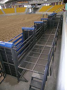 There are two different types of specialised crushes used in rodeo arenas. Those for the "rough stock" events, such as bronc riding and bull riding, are known as bucking chutes or rough-riding chutes. For events such as steer roping, the crush is called a roping chute. The rough-riding chutes are notably higher in order to hold horses and adult bulls, and have platforms and rail spacing that allows riders and assistants to access the animal from above. These chutes release the animal and the rider through a side gate. A roping chute is large enough to contain a steer of the size used in steer wrestling and may also have a seat above the chute for an operator. The steer or calf is released through the front of the chute.