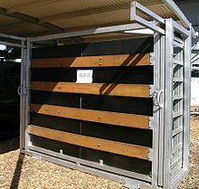 Lower side panels and/or gates of sheet metal, timber or conveyor belting are used in some cases to ensure animals' legs do not get caught and reduce the likelihood of operator injury.[4] At least one side gate is usually split to allow access to various parts of the animal being held, as well as providing access to feed a calf, amongst other things. A squeeze crush has a manual or hydraulic mechanism to squeeze the animal from the sides, immobilizing the animal while keeping bruising to a minimum. A sliding entrance gate, operated from the side of the crush, is set a few feet behind the captured animal to allow for clearance and prevent other animals entering. Crushes will, in many cases, have a single or split veterinary gate that swings behind the animal to improve operator safety, while preventing the animal from moving backwards by a horizontal rump bar inserted just behind its haunches into one of a series of slots. If this arrangement is absent, a palpation cage can be added to the crush for veterinary use when artificial insemination or pregnancy testing is being performed, or for other uses.[5] Older crushes can also be found to have a guillotine gate that is also operated from the side via rope or chain where the gate is raised up for the animal to go under upon entering the crush, and then let down behind the animal.