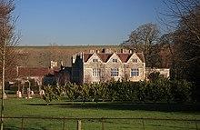 Pevsner describes it as a "fine square Elizabethan house ... exceptionally rich in plasterwork and fireplaces".[16] Built in banded limestone ashlar and flint, the house has a four-bay front with a three-storey porch. An attached 17th-century range, in chequered flint and stone, has a chapel and former minister's dwelling. To the northwest are 17th-century stables and an 1834 carriage house. 19th-century additions include a service and nursery wing, and a square water tower; work in 1877–1882 was designed by E. B. Ferrey under the ownership of Major-General A. G. Yeatman-Biggs, and on his death in 1898 the estate was inherited by his brother, Huyshe Wolcott Yeatman.[6]