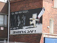 At the junction of Stokes Croft and Jamaica Street is a large mural,"The Mild Mild West", painted the 1990s by Banksy. It depicts a teddybear lobbing a Molotov cocktail at three riot police.[16] In 2007 the mural was voted Alternative Landmark of Bristol.[17]