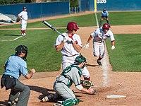 Second base is the base most often stolen, because once a runner is on second base he is considered to be in scoring position, meaning that he is expected to be able to run home and score on most routine singles hit into the outfield.[8] Second base is also the easiest to steal, as it is farthest from home plate and thus a longer throw from the catcher is required to prevent it. Third base is a shorter throw for the catcher, but the runner is able to take a longer lead off second base and can leave for third base earlier against a left-handed pitcher. A steal of home plate is the riskiest, as the catcher only needs to tag out the runner after receiving the ball from the pitcher. It is difficult for the runner to cover the distance between the bases before the ball arrives home. Ty Cobb holds the records for most steals of home in a single season (8) as well as for a career (54).[11] Steals of home are not officially recorded statistics, and must be researched through individual game accounts. Thus Cobb's totals may be even greater than is recorded.[11] Jackie Robinson famously stole home in Game 1 of the 1955 World Series. Thirty-five games have ended with a runner stealing home, but only two have occurred since 1980.[12] In a variation on the steal of home, the batter is signaled to simultaneously execute a sacrifice bunt, which results in the squeeze play. The suicide squeeze is a squeeze in which the runner on third begins to steal home without seeing the outcome of the bunt; it is so named because if the batter fails to bunt, the runner will surely be out. In contrast, when the runner on third does not commit until seeing that the ball is bunted advantageously, it is called a safety squeeze.