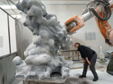 In the 21st century, stone sculpture has grown to encompass technologically advanced tools including robots, super computers, and algorithms. In 2017, Karen LaMonte first displayed Cumulus, her eight-foot-tall, two-and-a-half ton sculpture of a cumulus cloud carved from Italian marble. To create the work, LaMonte collaborated with California Institute of Technology scientists to model conditions needed to create a cumulus cloud. She then replicated the resulting cloud model in marble using a combination of robot and hand carving. "Rarely does someone just start chipping away in stone," LaMonte told Caltech magazine. "Think about Michelangelo; he submerged his wax model of David in water, exposing it layer by layer and carving the marble to match the emerging figure. Three hundred years later, Antonio Canova perfected the pointing machine to transfer exact points from a model onto marble, followed by Benjamin Cheverton’s patented 3-D pantograph. Only by using technology could I make the diaphanous solid and the intangible permanent." The sculpture required four weeks of robot-driven carving, followed by four weeks of hand-finishing, to complete.[6]